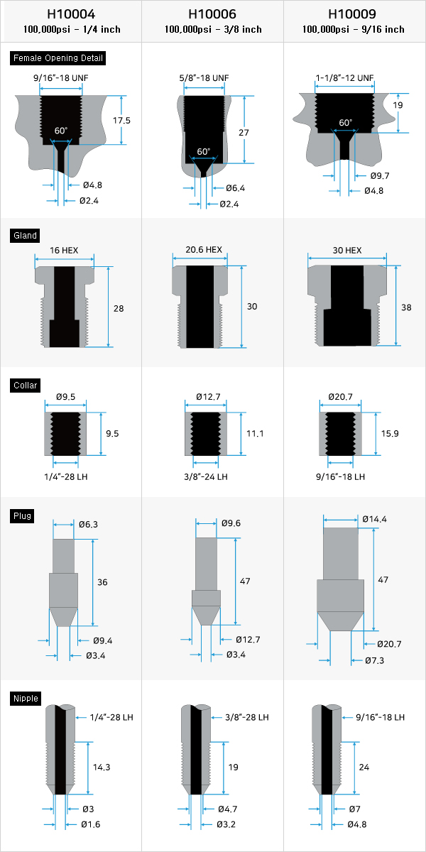 The product is tightened with collar and nipple in Gland. The applicable pipe size is as follows. This cone and threaded connection is the standard for easy and fast high-pressure equipment configuration with optimum sealing and reliable performance for both liquid and gas at high pressure and temperature.